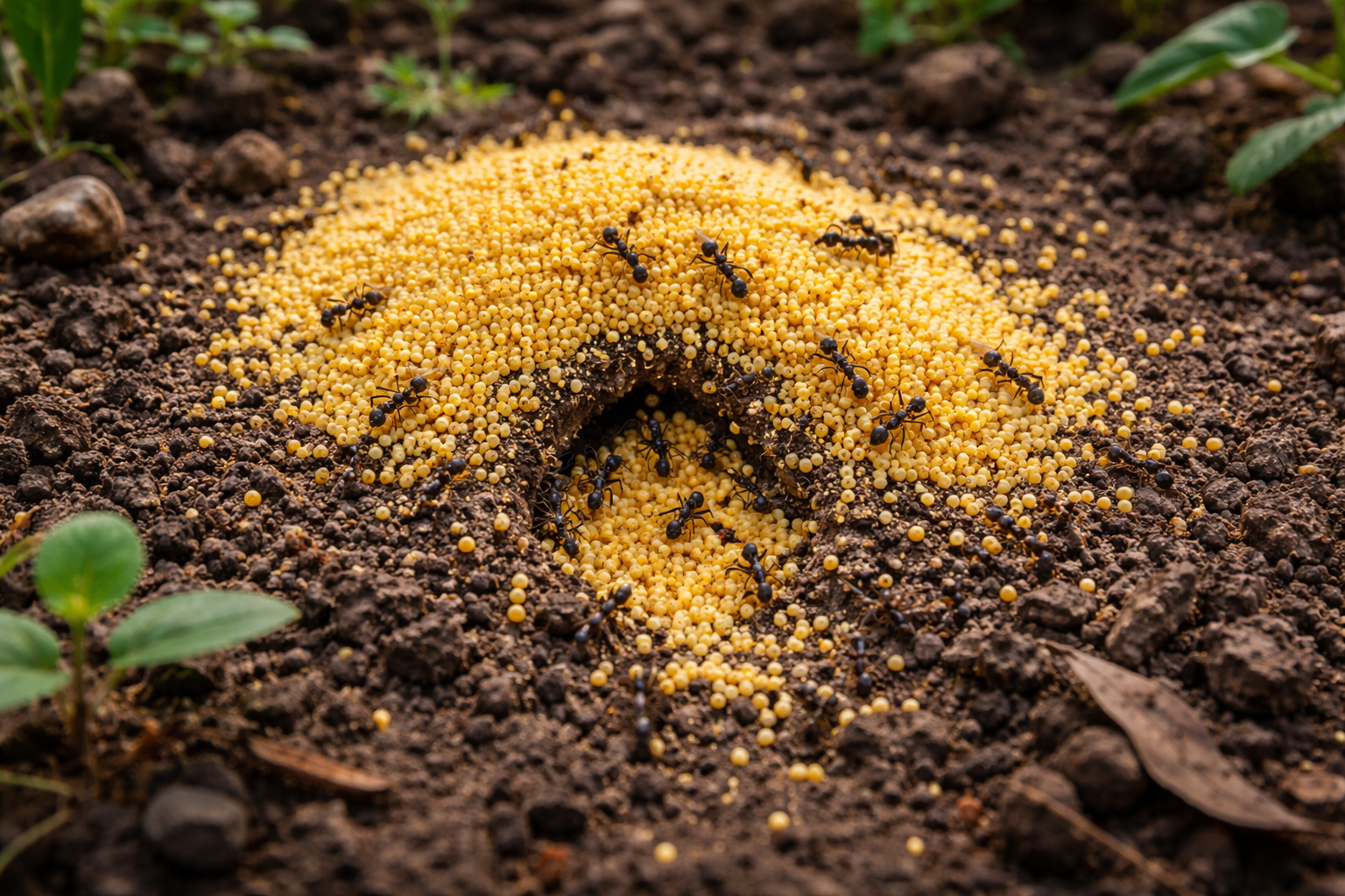 Hirssi vilja vaikuttaa hyönteisiin epätyypillisellä tavalla, muuttuen vaarattomasta tuotteesta tehokkaaksi työkaluksi alueen puhdistamiseen. Puutarhatuholaiset pitävät pieniä keltaisia jyviä kuningattarensa munina visuaalisen ja tuntoelimen samankaltaisuuden vuoksi. Työssäkäyvät yksilöt kantavat niitä aktiivisesti syvälle muurahaispesään. Pesän sisällä vilja turpoaa intensiivisesti maaperän kosteudesta ja tukkii fyysisesti maanalaiset käytävät. Lisäksi hyönteiset eivät pysty sulattamaan turvonnutta tärkkelystä, mikä johtaa pesäkkeen kuolemaan, kun ne yrittävät kuluttaa ravintovarastoja.