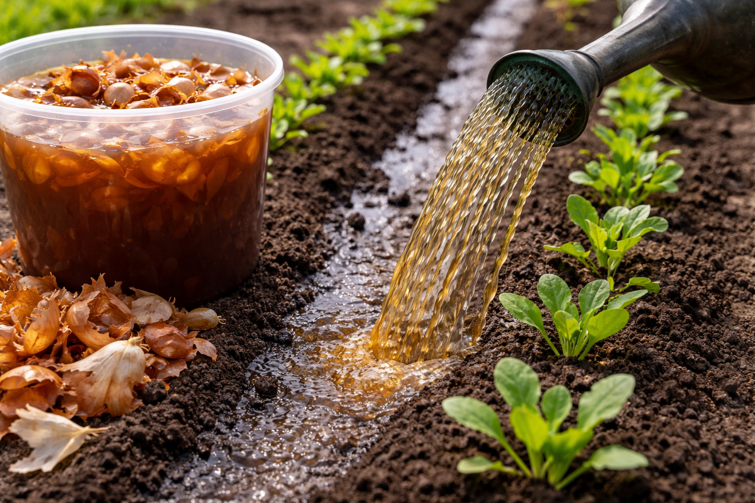 Tavallisen sipulin kuivat suomut sisältävät tehokkaan cocktailin hyödyllisiä alkuaineita. Täällä soitetaan pääviulua fytonsidit – luonnolliset antibiootit, jotka estävät patogeenisen mikroflooran kasvua. Maa tarvitsee lempeää heräämistä talven jälkeen, ja luomukastelu tekee tämän parhaiten.