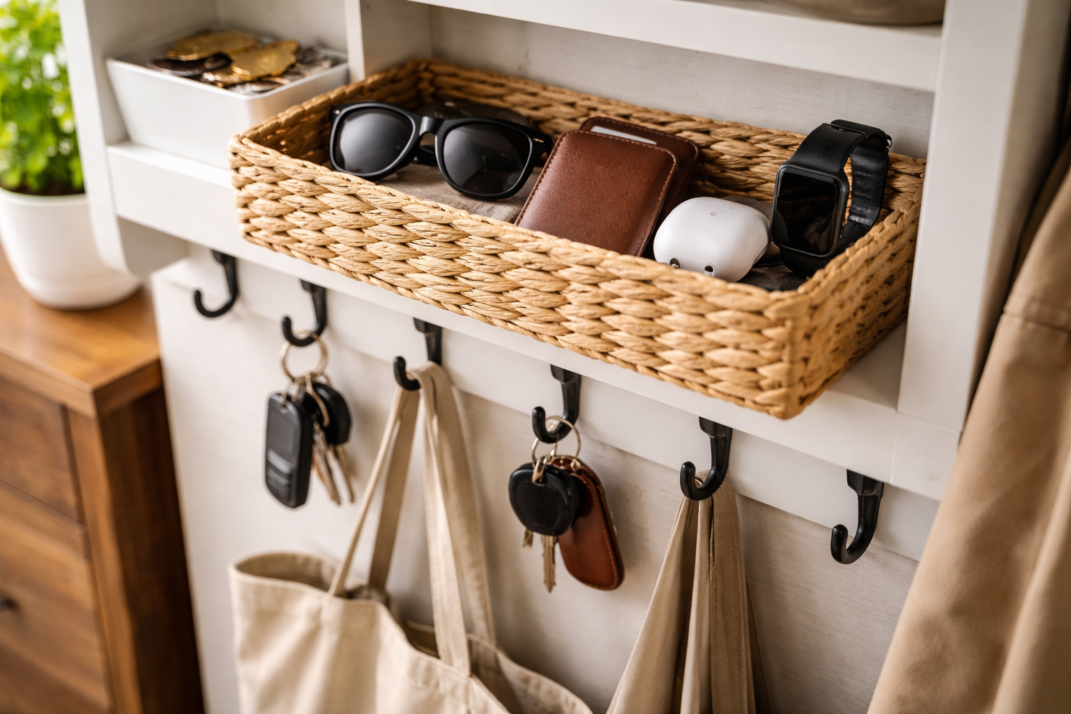 Pääsalaisuudeni: säilytä käytävällä ”laiskuuskori” tavaroille, joita et ehdottomasti halua jättää pois juuri nyt raskaan päivän jälkeen. Puhdista tämä kori kerran viikossa ja muu kotisi kimaltelee puhtaana ilman vaivaa.