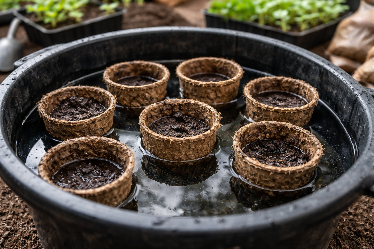 Oikean kosteustason ylläpitäminen on puoli voittoa. Huokoinen turpeen humusrakenne sillä on ominaisuus aktiivisesti haihduttaa vettä. Jos tätä prosessia ei valvota, savipallo kuivuu muutamassa tunnissa, mikä on kriittistä nuorille ja heikoille taimille.