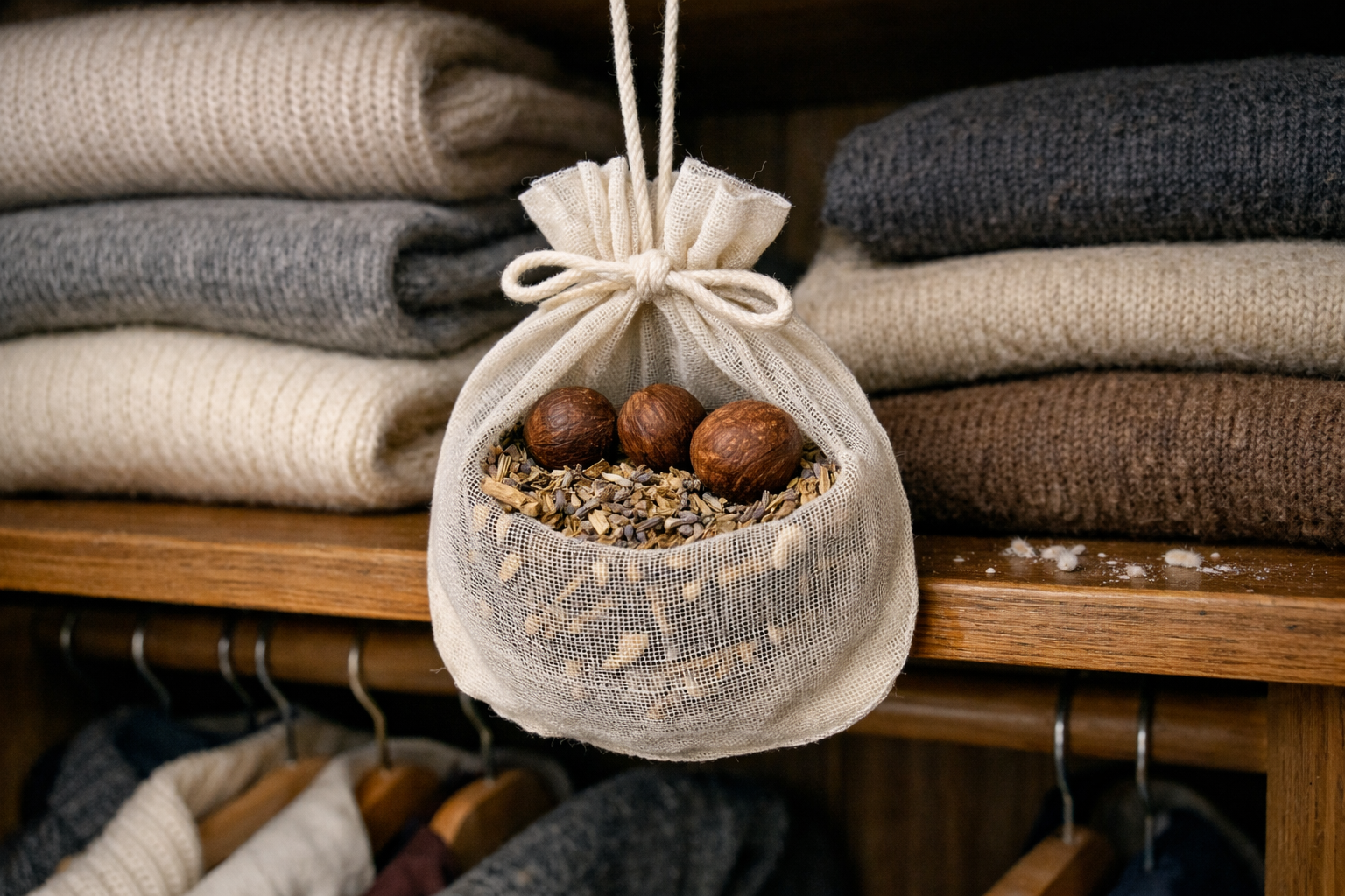 Ihanteellisen tuloksen saavuttamiseksi suosittelen useiden menetelmien yhdistämistä. Ensin suoritetaan syvä mekaaninen puhdistus ja sitten asennetaan luonnollinen karkote. Aseta ulos setripallot tai paksut kangaspussit kuivatuilla yrteillä talvitakkien taskuissa. Kuivatut neilikka, rosmariini ja timjami tekevät erinomaista työtä.