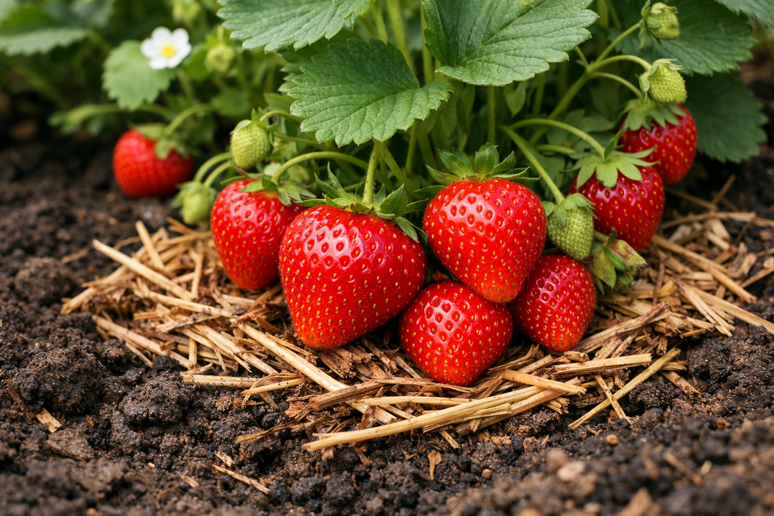 Säännöllinen puhdas olki säilyttää erinomaisen veden ja suojaa kypsyviä hedelmiä kosketukselta kostean maan kanssa.
