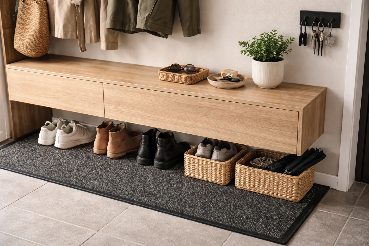 Mutaiset jalanjäljet, hajallaan olevat kengät ja jatkuva avainten etsiminen aamulla voivat pilata mielialan koko päiväksi. Olen kehittänyt hyväksi havaitun algoritmin, joka auttaa järjestämään tilan niin, että puhtaus säilyy lähes itsestään.