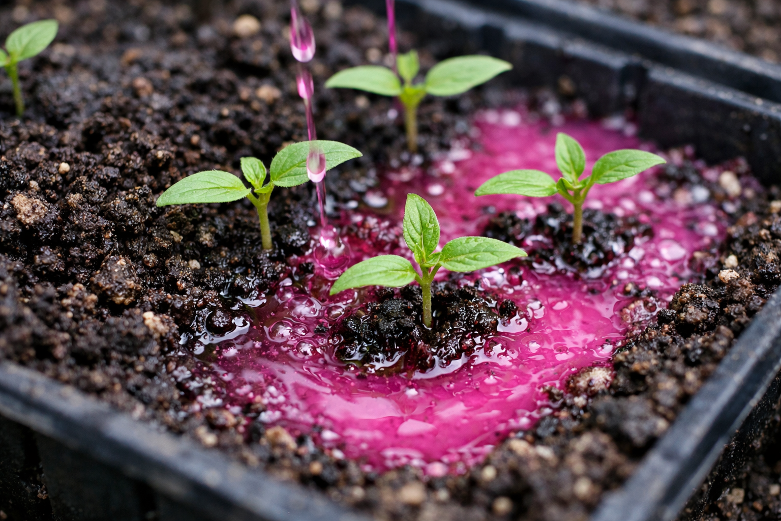 Älä koskaan kastele tiivistettyä kaliumpermanganaattia kuivaan maaperään, koska tämä johtaa väistämättä peruuttamattomiin kemiallisiin palovammoihin juurikarvoihin.