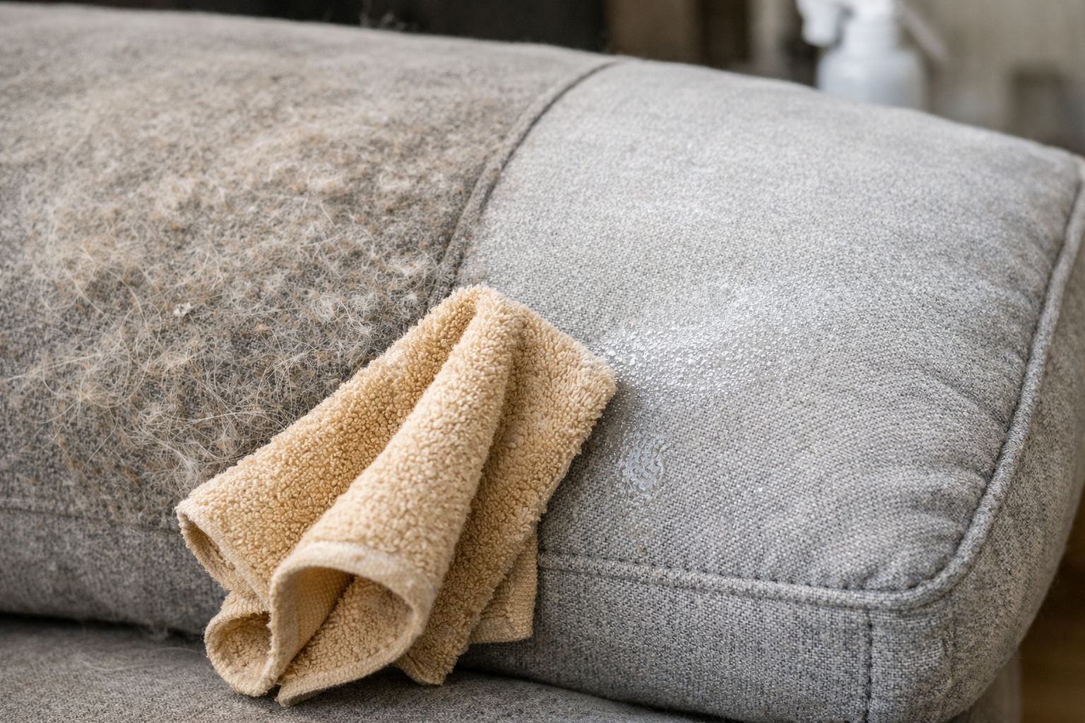 Tärkeä vinkki: Ennen kuin teet mitään suurpuhdistusta, muista testata tätä kotitekoista suihketta huomaamattomalle verhoilun alueelle varmistaaksesi huonekalujesi värinkesto.