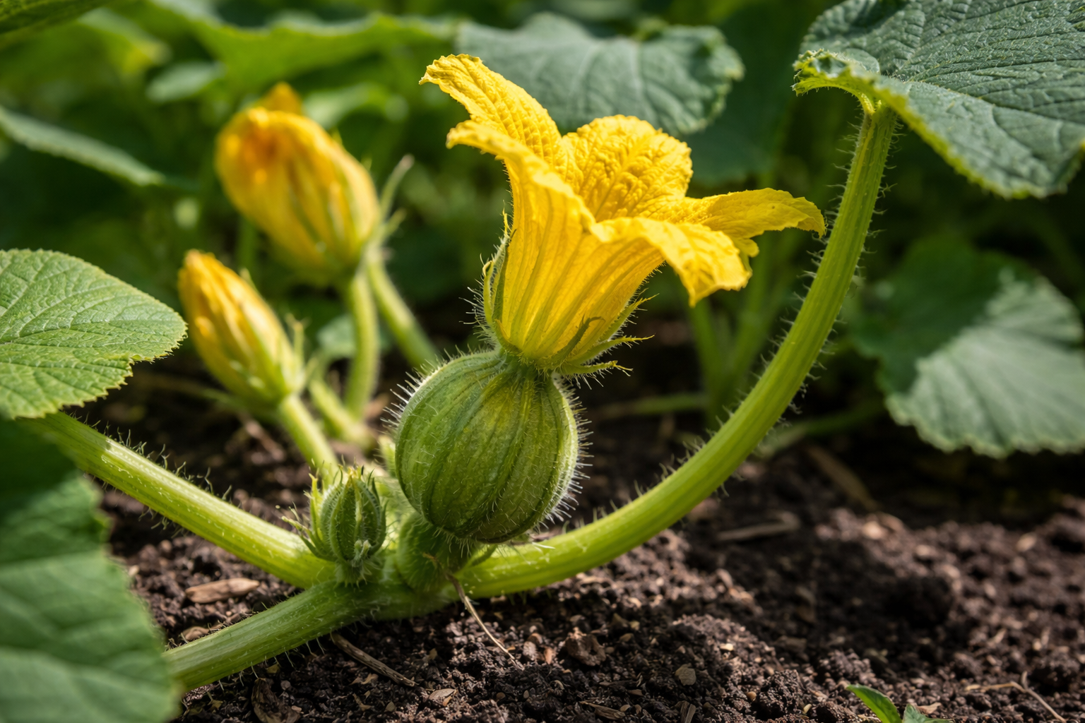 Naaraskukan tyvessä on havaittavissa oleva visuaalinen paksuuntuminen pienen pyöreän kurpitsan muodossa.