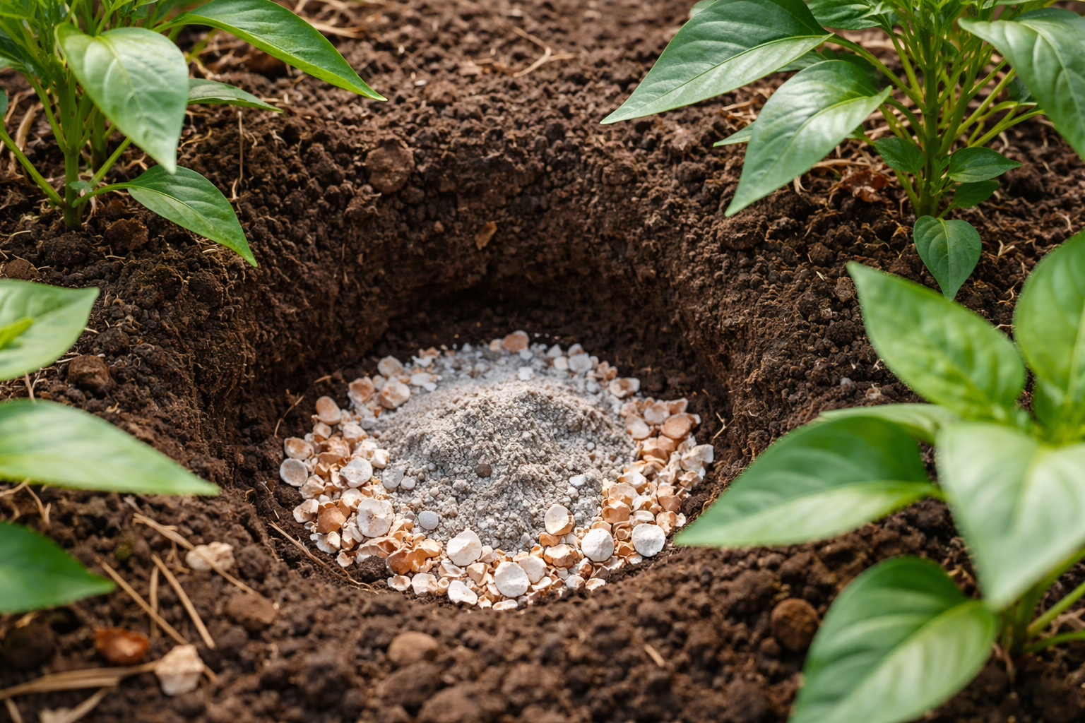 Pääsalaisuudeni on käyttää kourallinen murskattuja munankuoria ja ruokalusikallinen puutuhkaa aivan reiän pohjalla, mikä suojaa kukinnan loppumätä vastaan ja antaa juuristolle vahvan alun.