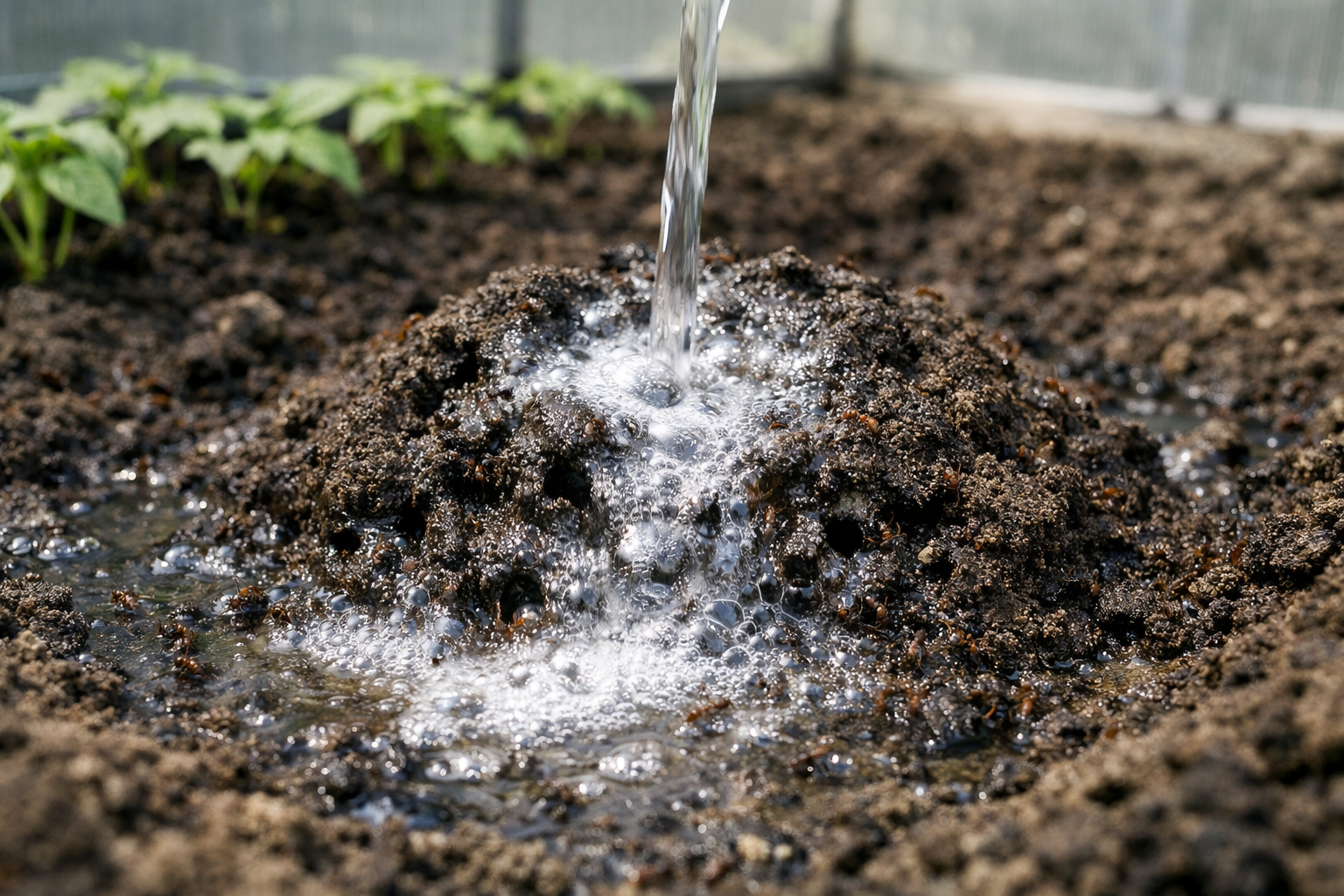 ”Älä koskaan kaada kiehuvaa vettä muurahaispesän päälle suoraan tomaattipensaan alle, sillä se kypsentää välittömästi kasvien juuret ja tuhoaa taimen.”