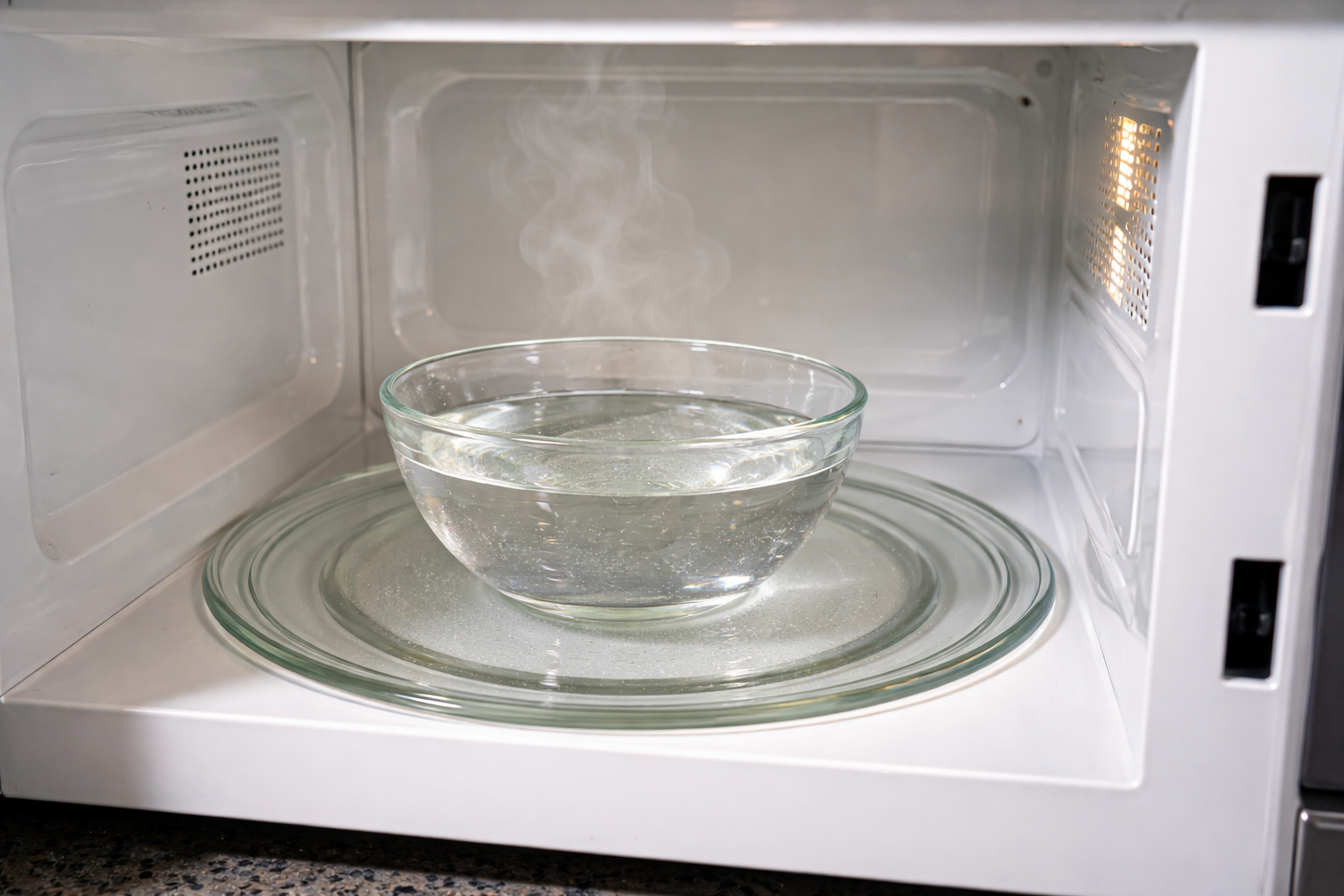 Menetelmän ydin on luoda tehoste kameran sisään höyrysauna. Vesi kiehuu, höyry laskeutuu seinille ja liuottaa hellävaraisesti kuivuneita ruokajäämiä.